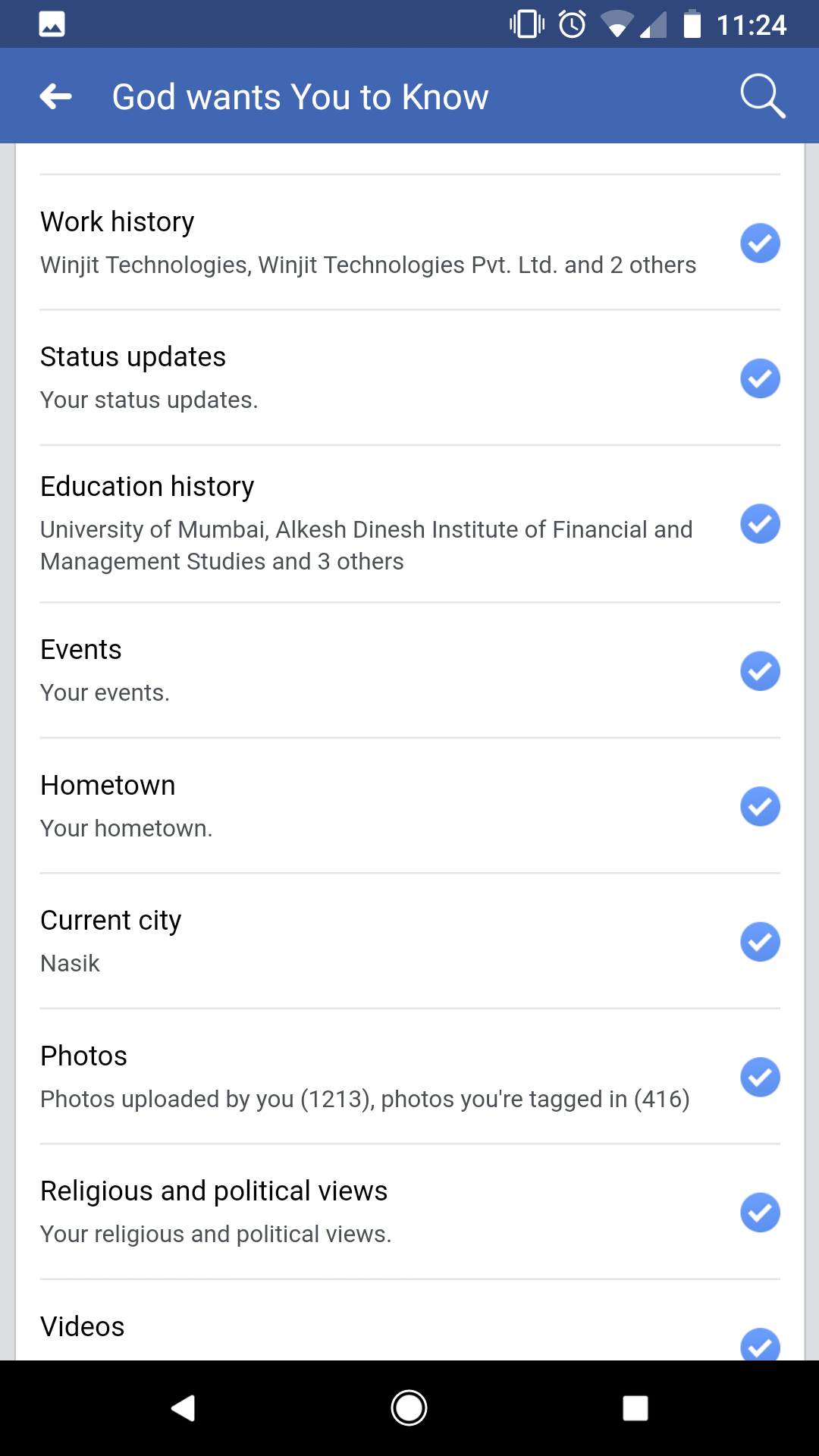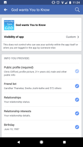 I clicked on the first app, and to my HORROR! it was collecting my name, dob, location, my complete friend list, my photos (1300+) my Tagged photos (400+), all my videos, all my status updates, all my checkin, all the pages that I like, my website etc.
